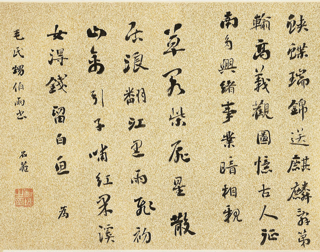 釋文:奉陪嚴中丞西城晚眺。汲黯匡君切。廉頗出將頻。直詞才不世。雄略動如神。政簡移風速。詩清立意新。層城臨暇景。絕域望餘春。旗尾蛟龍會。樓頭燕雀馴。地平江動蜀。天闊樹浮秦。帝念深分閫。軍書遠筭緡。花羅封蛺蝶。瑞錦送麒麟。辭第輸高義。觀圖憶古人。征南多興緒。事業暗相親。草閣柴扉星散居。浪翻江黑雨飛初。山禽引子嘯紅果。溪女得錢留白魚。為毛氏甥伯雨書。石菴。