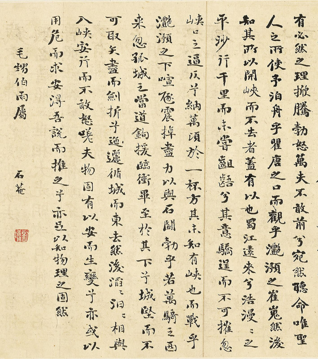 釋文:灔澦堆賦并序。世以瞿唐峽口灔澦堆為天下之至險。凡覆舟者皆歸咎於此石。以余觀之。蓋有功於斯人者。夫蜀江會百水而至於夔。瀰漫浩汗。橫放於大野。而峽之小大曾不及其十一。苟先無以齟齬於其間。則江之遠來奔騰迅快盡銳於瞿唐之口。則其嶮悍可畏當不啻於今耳。因為之賦。以待好事者試觀而思之。 天下之至信者。唯水而已。江河之大與海之深。而可以意拂。唯其不自為形。而因物以賦形。是故千變萬化而有必然之理。掀騰勃怒萬夫不敢前兮。宛然聽命。唯聖人之所使。予泊舟乎瞿唐之口。而觀乎灔澦之崔嵬。然後知其所以開峽而不去者。蓋有以也。蜀江遠來兮。浩漫漫之平沙。行千里而末嘗齟齬兮。其意驕逞而不可摧。忽峽口之逼仄兮。納萬頃於一杯。方其末知有峽也。而戰乎灔澦之下。喧豗震掉。盡力以與石鬪。勃乎若萬騎之西來。忽孤城之當道。鉤援臨衝畢至於其下兮。城堅而不可取。矢盡而劍折兮。迤邐循城而東去。然後滔滔汨汨相與入峽。安行而不敢怒。嗟夫。物固有以安而生變兮。亦或以用危而求安。得吾說而推之兮。亦足以知物理之固然。毛甥伯雨屬。石菴。