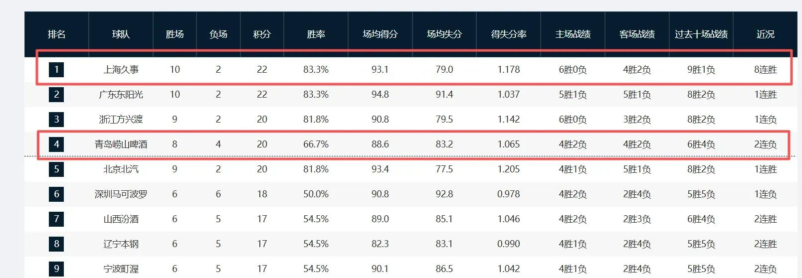 一夜两场大败!上海8连胜稳坐榜首,广东险胜,青岛主场2连败