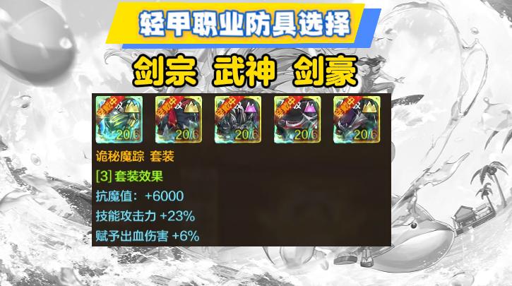 至于轻甲防具,无尽贪欲MP套和诡秘魔踪其实半斤八两,如果为了省事!武神、剑宗、剑魂等轻甲职业,最优选择就是诡秘魔踪。因为MP套又要控蓝,伤害还没优势,不要轻易选。