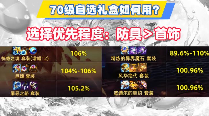 因为70级自选礼盒,没有武器和左槽,因此只分析防具和首饰的选择。