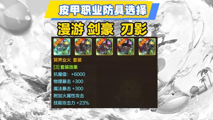 最后是皮甲!在bug修复后,业火套伤害已经高于游龙套了,因此漫游、剑豪、刃影等职业,最优选择是冥界业火防具。