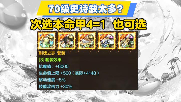 如果此时本命甲下的次选史诗防具4=1了,比如重甲“钢魂”,那直接选钢魂了!先爽1个月再说,土龙也能提升容错率,至于真理慢慢刷,没准后续活动都白送70级自选史诗了,再考虑换全套真理。