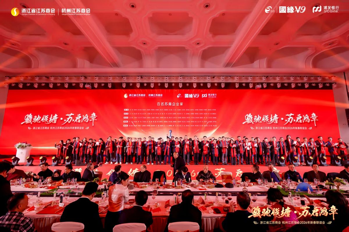 1月3日,浙江省江苏商会2026年新春联谊会隆重召开。会上,百名苏商代表手持宣言手册整齐列队,在会长祝斌的领诵下,齐声诵读《完善现代企业制度 实现企业科学治理》联合宣言,台下1200余名在浙苏商代表起立呼应,共同向新时代递交了一份铿锵有力的答卷。