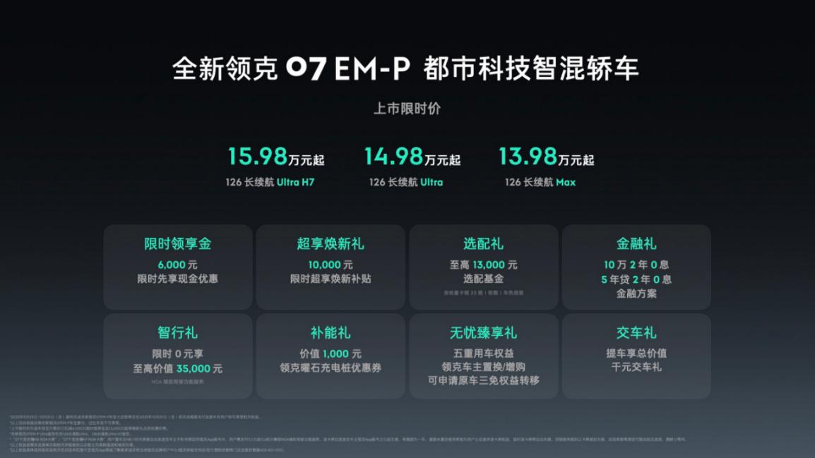 全新有为,极智新境。9月25日,都市科技智混轿车——全新领克07 EM-P正式上市。新车共推出126长续航Max、126长续航Ultra、126长续航Ultra H7三款配置版本,上市限时价13.98万元起。同时,全新领克07 EM-P还准备了限时领享金、超享焕新礼、选配礼、金融礼、智行礼、补能礼、无忧臻享礼、交车礼在内的8重限时福利。