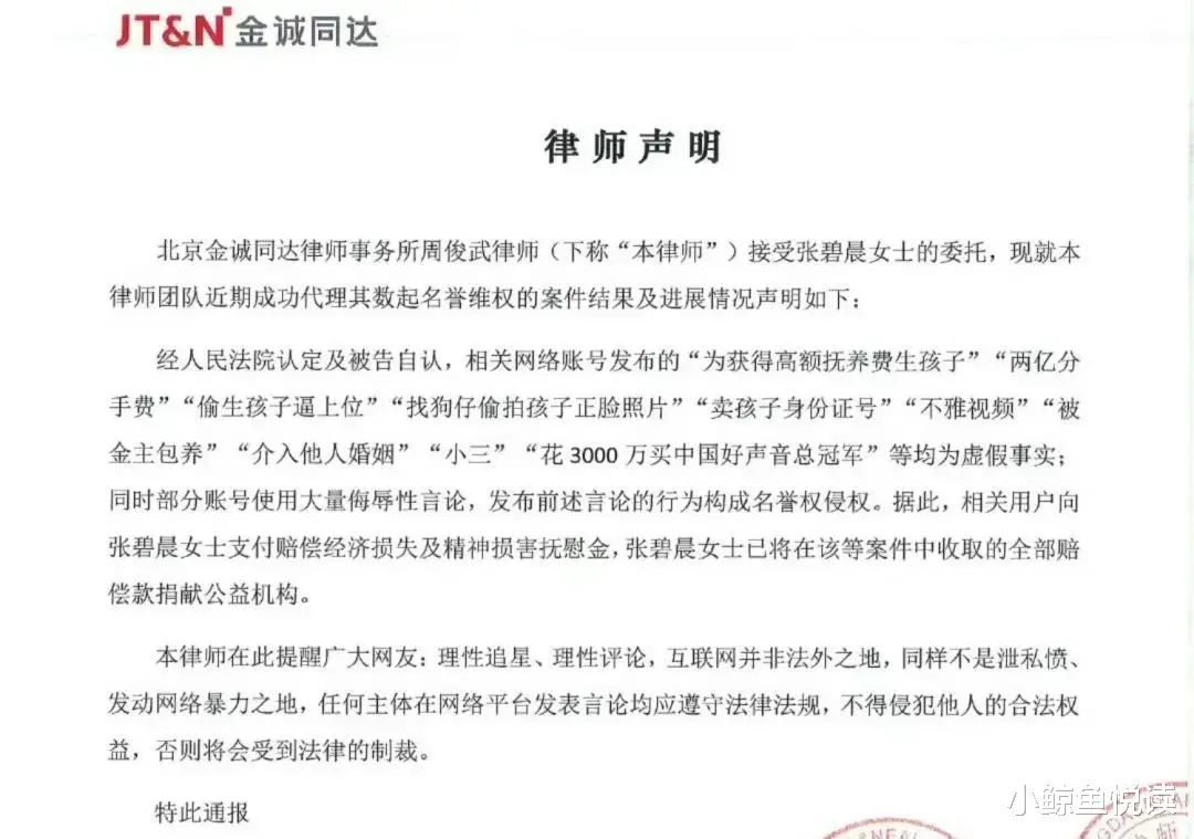 3月18日,张碧晨方律师公布了多起名誉wei权案获胜。