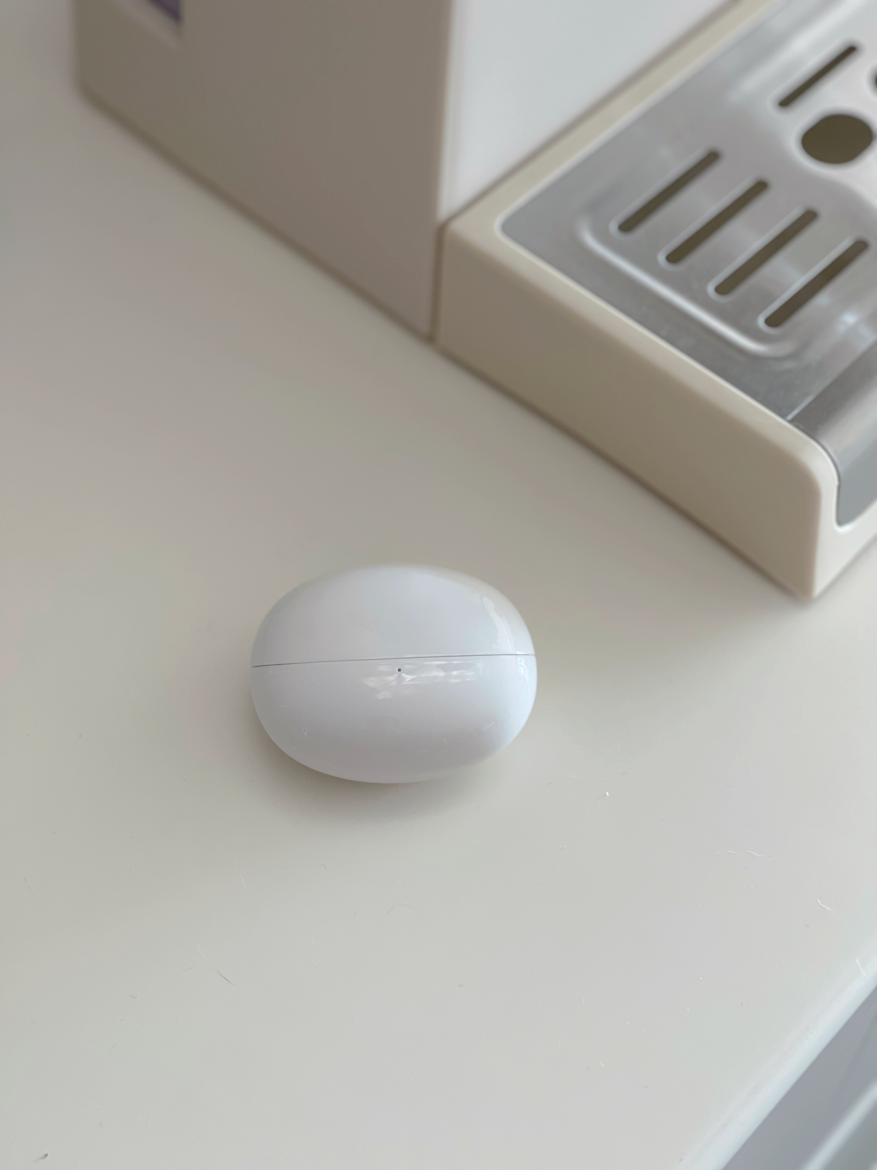 我选的是白色款,质感很高级。C桥耳挂结构看起来像个小号的蓝牙麦克风,但上耳之后非常贴合。整体线条柔和,耳挂弧度自然贴合耳形,金属质感的LOGO点缀在侧面,低调又有科技感。