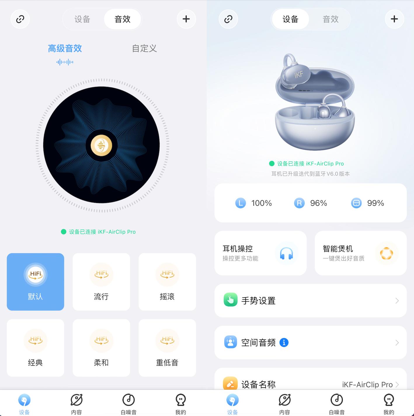 iKF的APP界面简洁,连接过程很顺畅。可以自由调节EQ、定义触控操作、切换模式。比如我把“双击”改成切歌,长按是模式切换,用起来顺手多了。还能调低漏音、增强低频,可玩性挺高。