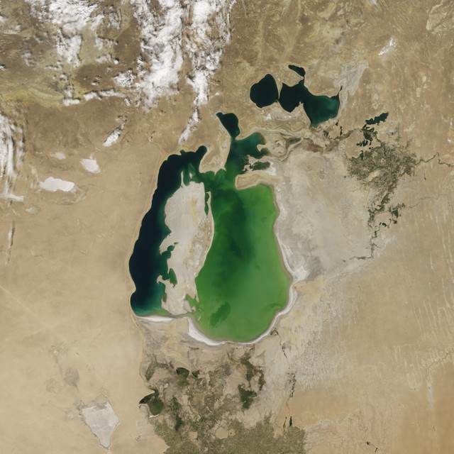 咸海的水位下降了十几米,水面面积缩水了一半以上。原本完整的湖泊,因为中间高地露出水面,断裂成了两半:北边的北咸海,和南边的南咸海。