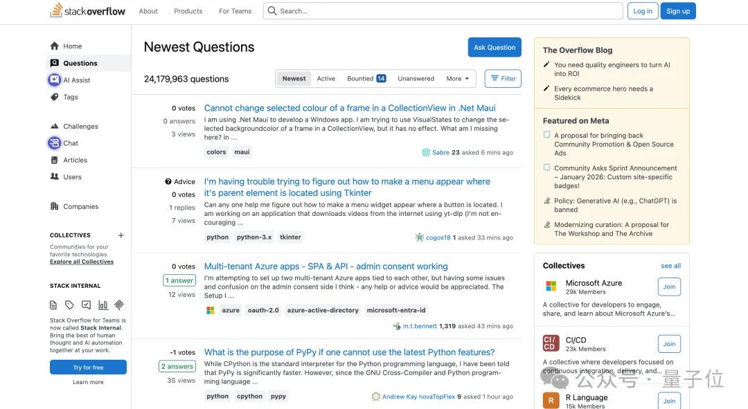 Stack Overflow缺乏吸引新用户加入的渠道,老用户逐渐转向大模型交互,平台上有关新技术的讨论也日渐稀少。