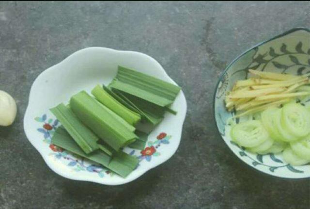 第二步,把姜切丝,蒜切了蒜和蒜苗,大葱都切成小片片;