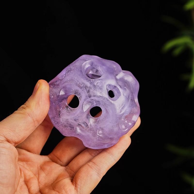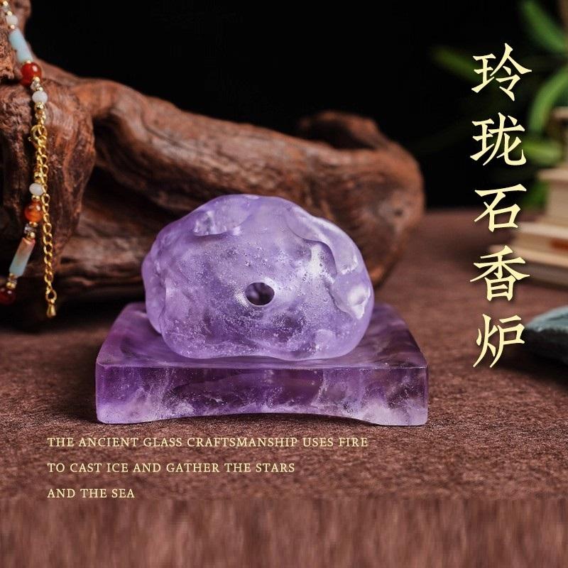 在造型上,古法琉璃玲珑石香炉常常借鉴传统的鼎式、莲花式、博山式等经典造型。鼎式香炉庄重古朴,象征着权力与威严,其沉稳的三足设计,仿佛承载着千年的历史厚重感,让人不禁联想到古代帝王祭祀时的宏大场面。莲花式香炉则清新雅致,莲花瓣层层叠叠,细腻逼真,仿佛一朵盛开在香雾中的圣洁之花,给人以宁静祥和之感。博山式香炉更是独具匠心,其山峦起伏的炉盖,云雾缭绕间,仿佛将仙境浓缩于方寸之间,点燃香料后,袅袅青烟从炉盖的孔洞中升腾而起,宛如仙山云雾,充满了神秘的浪漫气息。