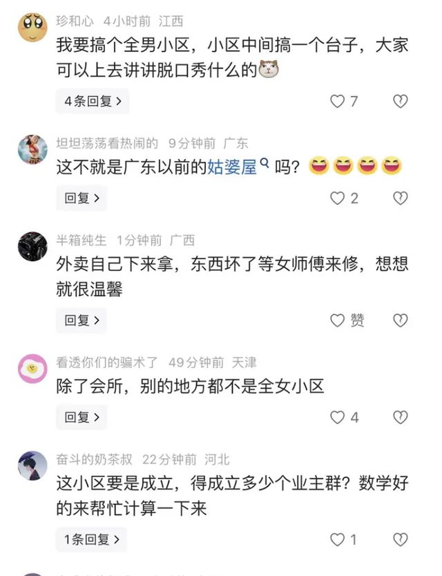 有网友说,鼓励一下吧,门卫是女的,维修是女的,电信快递都是女的派送,救火啊水暖维修维护都要求是女的才好,这才是全女小区,鼓励加油!