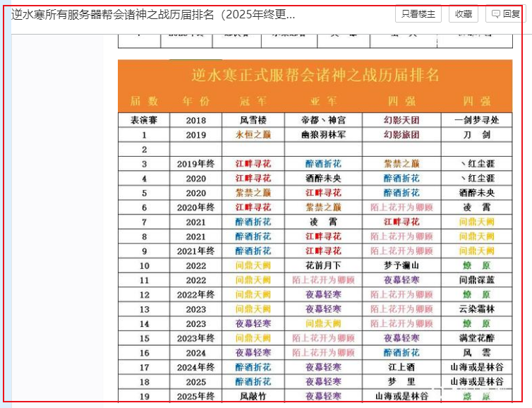 蓝杉的实力在赛事中展现得淋漓尽致。其带领的“醉酒折花”帮会,在2018至2025年的诸神之战中斩获7次冠军,仅黄金服开启后便连续两届登顶。