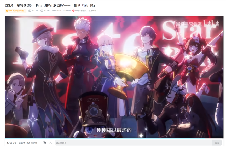 今年7月,米哈游旗下《崩坏:星穹铁道》与知名动画《Fate/staynight[UnlimitedBladeWorks]》(以下简称《Fate[UBW]》)的联动正式开启, 7月10日《崩坏:星穹铁道》推出的联动前瞻PV「相见『很』晚」,截至目前其播放量已达500万,并成功入选B站第329期“每周必看”榜单,玩家对这段PV的评价是这个联动真的好心动啊,《崩坏:星穹铁道》的体验实在太爽了。进一步印证了,玩家对联动合作的高关注度。