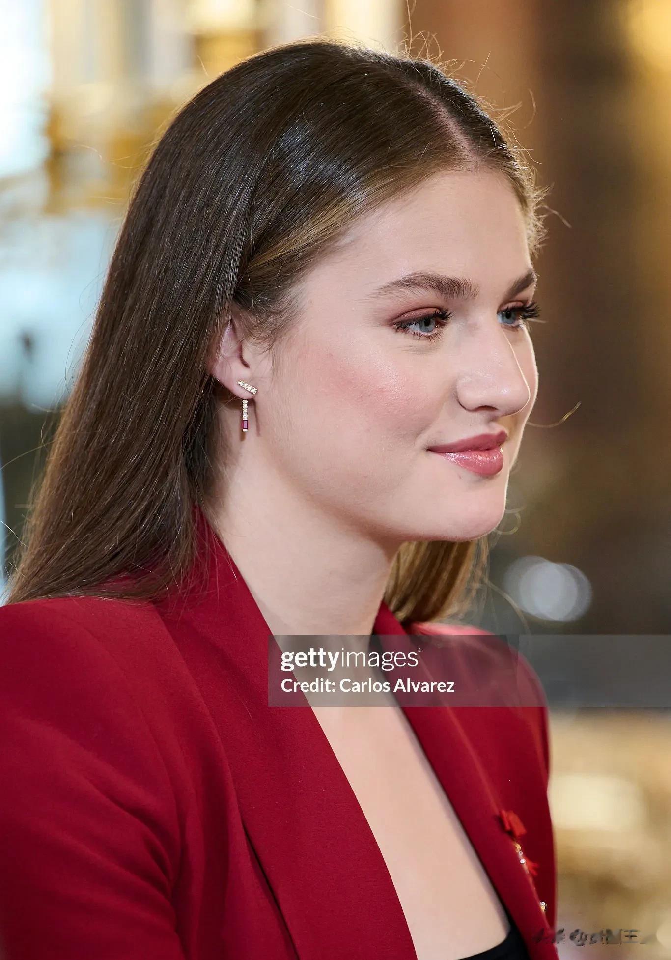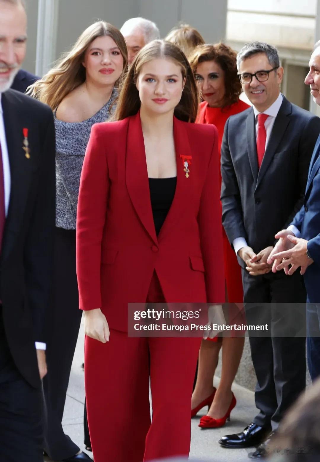 当天莱昂诺尔公主一身红色西装亮相,内搭黑色吊带,脚踩黑色粗跟鞋,披着金色的长发优雅气质。