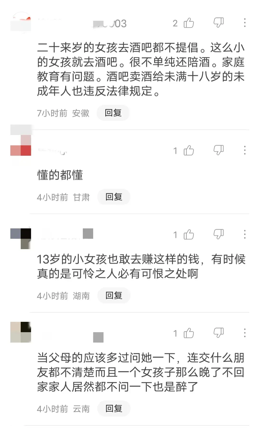 这件事引发了广大民众的热议,网友们各抒己见。有的网友认为二十多岁少女跑到酒吧就是不对,更何况她们还会陪酒。这种做法显得不太地道,暴露出来的可是家庭教育问题。同时,就酒吧在未成年人饮酒方面的操作也是违背法律规定的。还有很多人认为家属也有责任,他们应该密切关注孩子的行踪,了解他们结交的朋友。一个女孩子大半夜还在外头晃悠,连自己家人都从未对此进行过干预,这都揭示出家庭教育存在很大的问题。