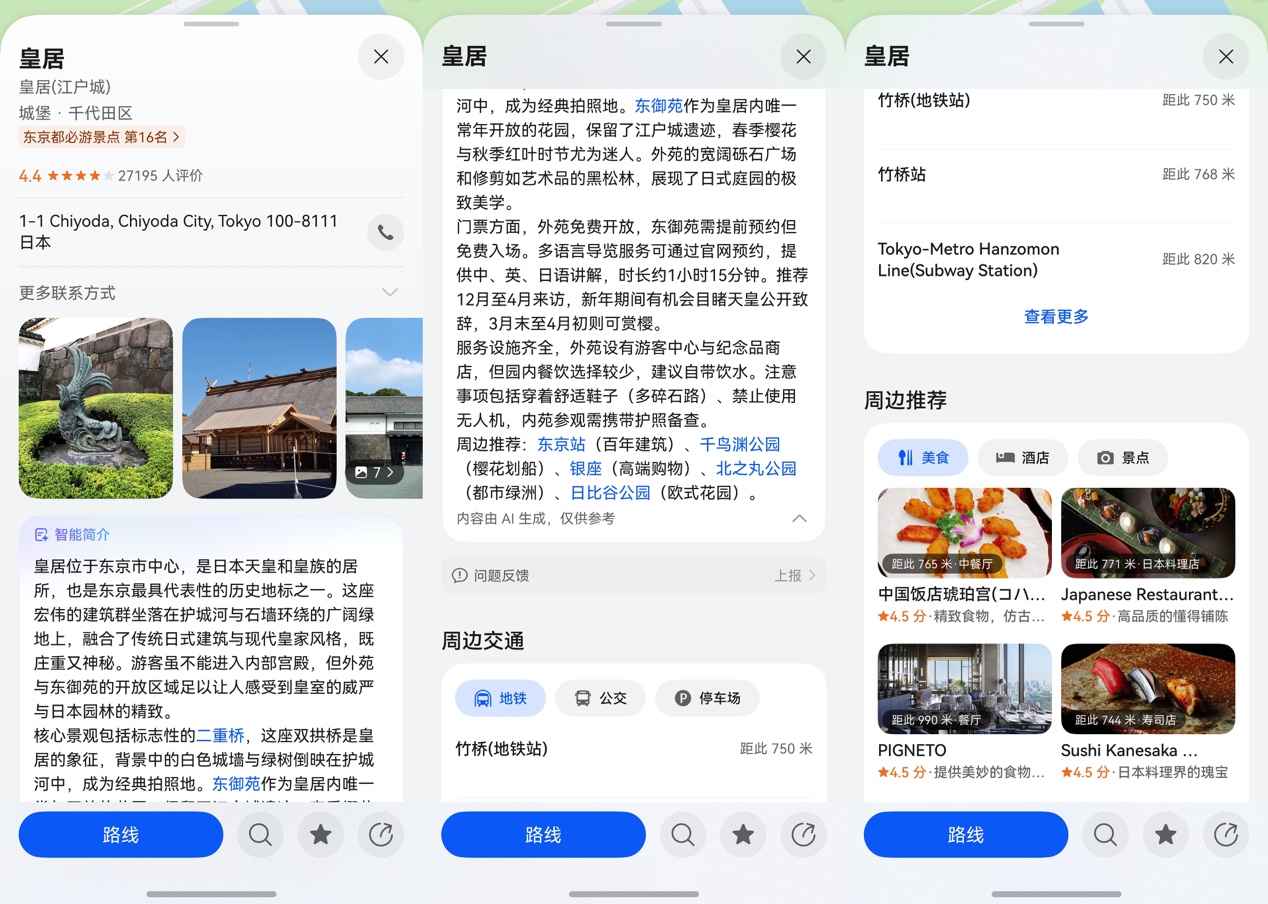 而且花瓣地图的定位也特别稳定,几乎不会出现定位漂移的情况。像东京皇居、首尔景福宫这些热门景点,还附带了景点的AI简介和周边的特色美食推荐,就像一个随身导游,智能实时生成景点介绍。