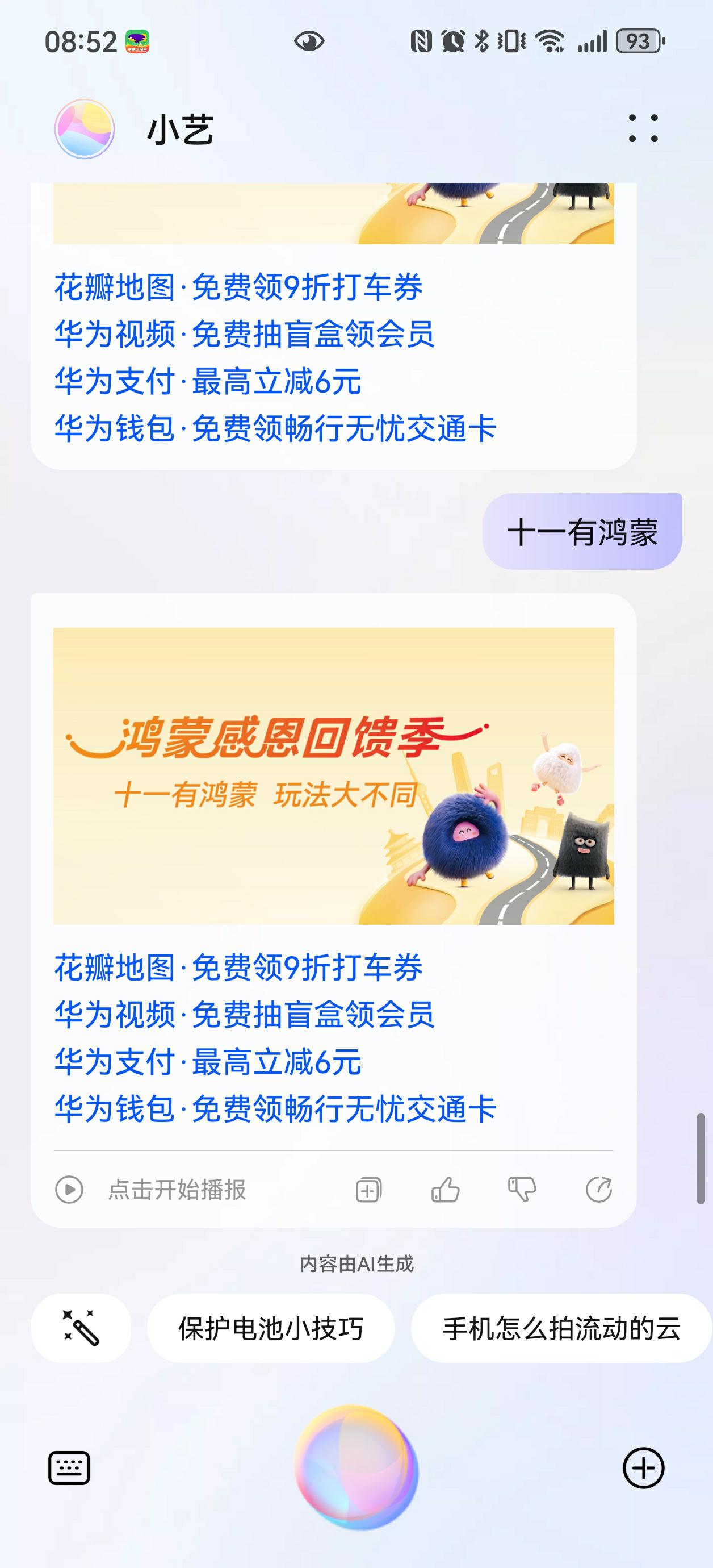 对了,十一期间长按华为手机电源键唤醒小艺,说“十一有鸿蒙”,还可享华为视频免费抽盲盒领会员等各种好礼,小伙伴们记得领。