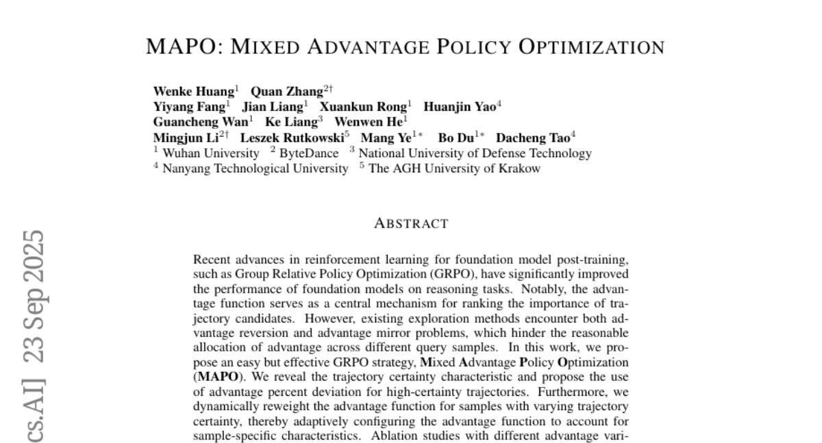 为了解决这些问题,研究团队提出了一种全新的训练方法,叫做MAPO(混合优势策略优化)。这个方法的核心思想是"看菜下碟",也就是根据不同情况的特点来调整评分策略。