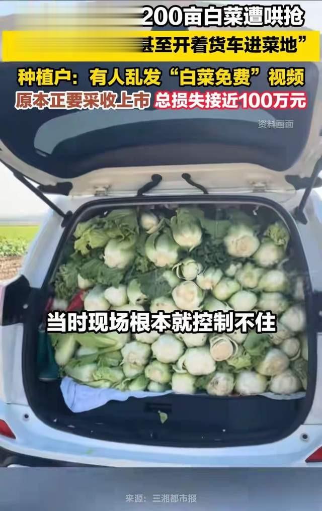 内蒙200亩白菜遭哄抢近日内蒙古赤峰近200亩白菜遭七八百人哄抢,这些人提着砍刀,拿着麻袋,跟土匪一样把白菜抢个精光。