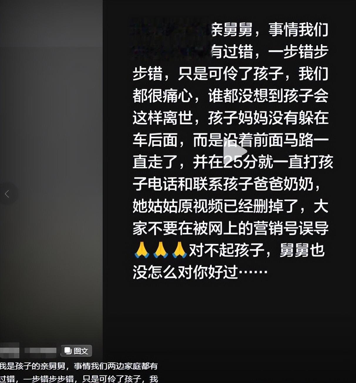 1月14号,就在母亲被网暴得喘不过气的时候,孩子的舅舅站了出来,直接曝出了事件的全部真相,让舆论来了个180度大反转。舅舅明确表示,所谓的“妈妈躲藏”根本就是子虚乌有,真实情况是妈妈当时顺着马路正常离开的,全程没有躲在车后。