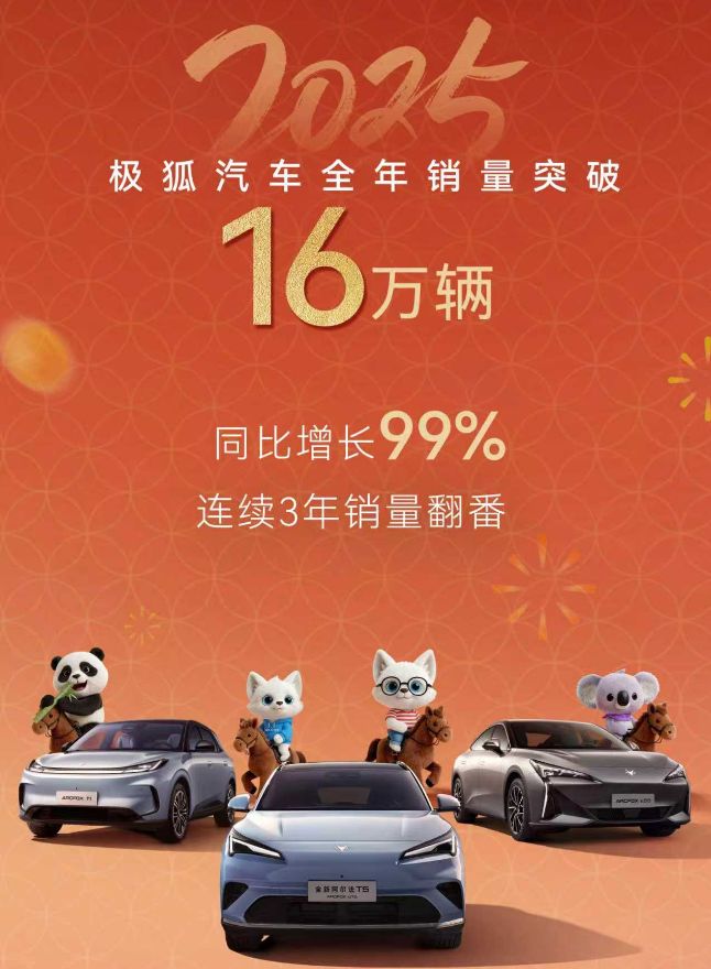 先来回顾一下极狐的成绩单:2024全年累计销量超8万台,同比增长170%。2025上半年销量5.5万辆,同比增长超过200%。去年下半年,极狐更是迎来爆发式增长:9月售出1.6万辆,10月-12月连续月销稳定在2万+。至此,2025全年,极狐销量超过了16万辆,同比增长99%,成为年度增长最快、势头最猛的品牌之一。