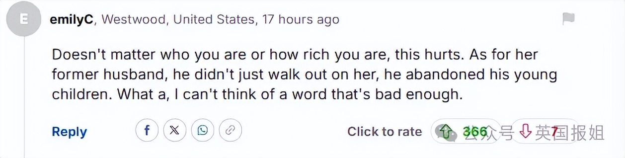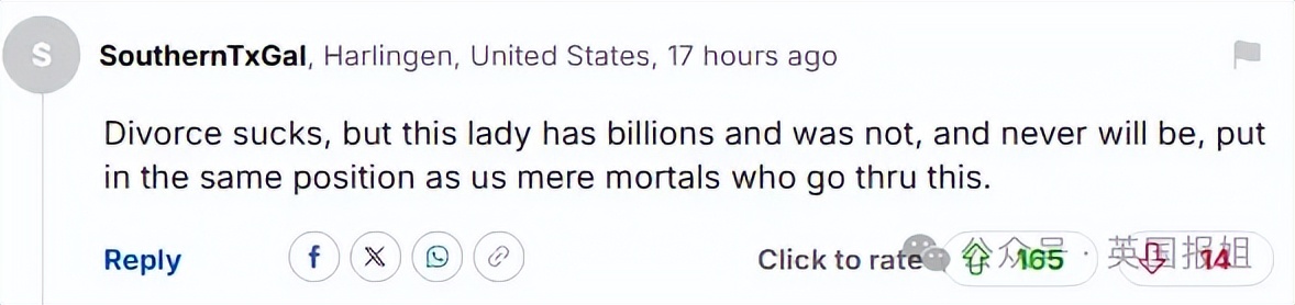 “离婚固然糟糕,但这位女士拥有亿万家产,她过去没有,将来也不会像我们这些经历离婚的凡人一样,陷入同样的境地。”