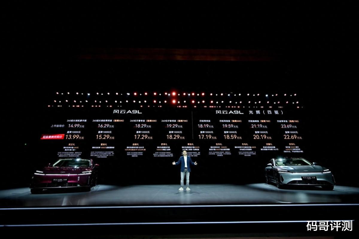 2025年11月15日,"进化"风云A9L光辉(四驱)全球上市发布会在重庆广阳岛国际会议中心隆重举行,本次上市共推出四款版型,正式售价为17.19万元起,共推出四个版本车型,其中四驱尊贵版售价17.19万、四驱高能版(猎鹰500)售价18.59万、四驱巅峰版(猎鹰700)售价20.19万、 四座尊享版(猎鹰700)售价22.69万。并同步推出"九大购车权益",涵盖高定、置换、金融、舒享、尊驰、驭风、充电、流量、质保多重礼遇,为中国豪华汽车市场再次立下全新标杆。