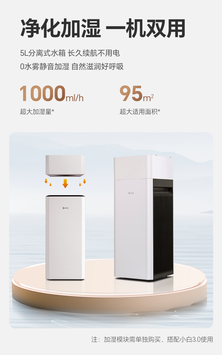 针对干燥季节,还支持 “净化+加湿” 组合:搭配单独购买的加湿模块,5L水箱实现1000ml/h加湿量,0水雾静音设计,秋冬季节无需额外加湿器,兼顾洁净与湿润,避免呼吸道干燥不适。