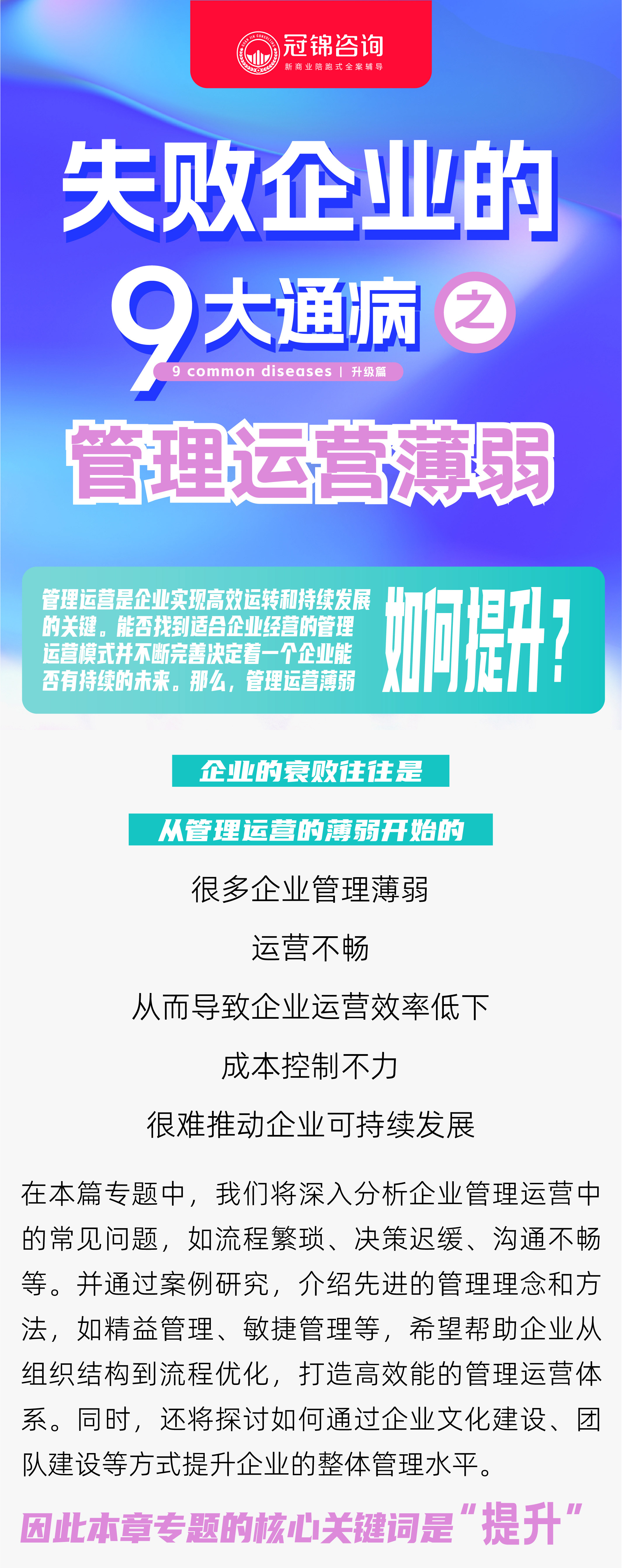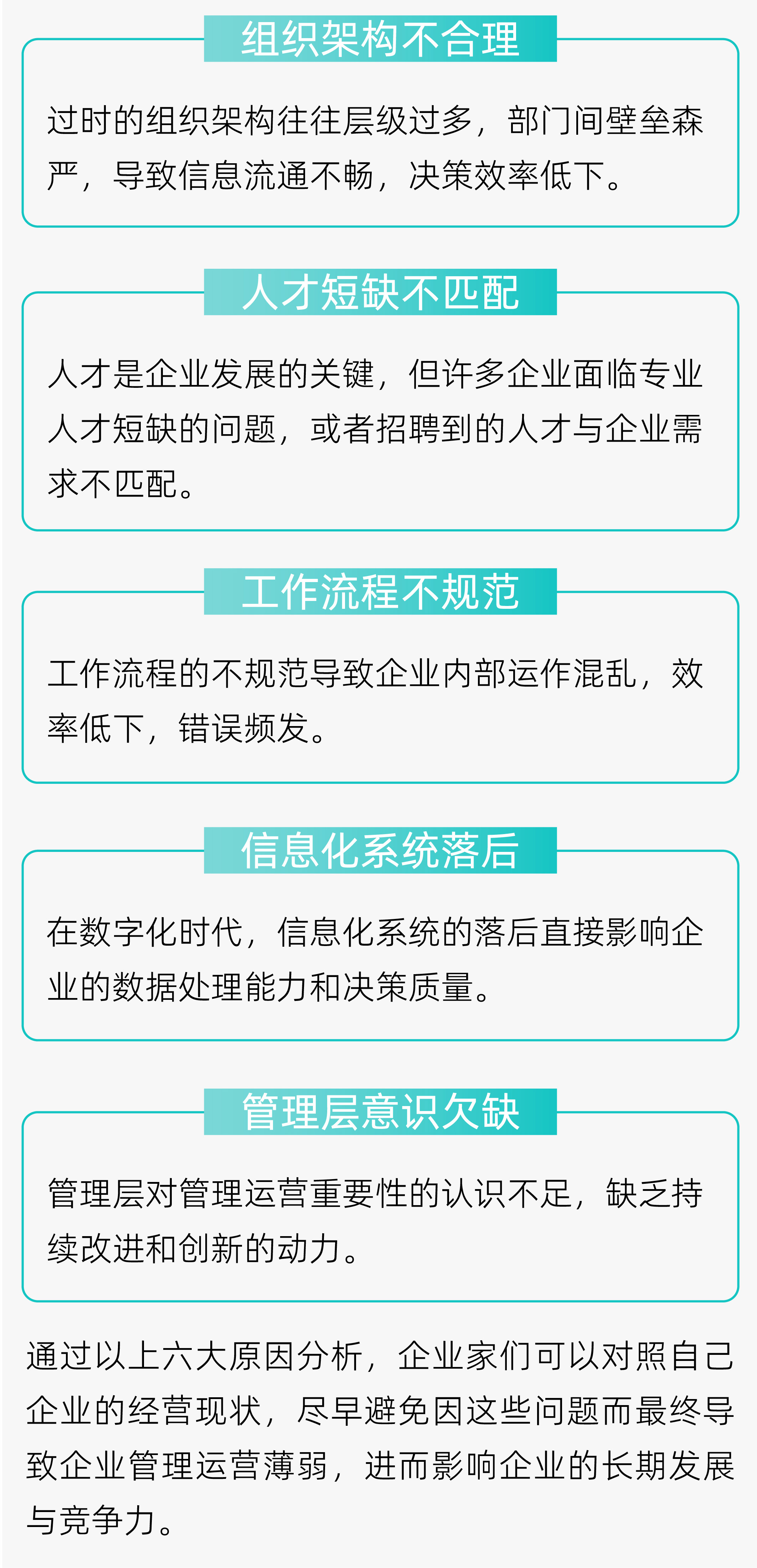 管理运营是企业实现高效运转和持续发展的关键。能否找到适合企业经营的管理运营模式并不断完善决定着一个企业能否有持续的未来。那么,管理运营薄弱,如何提升?