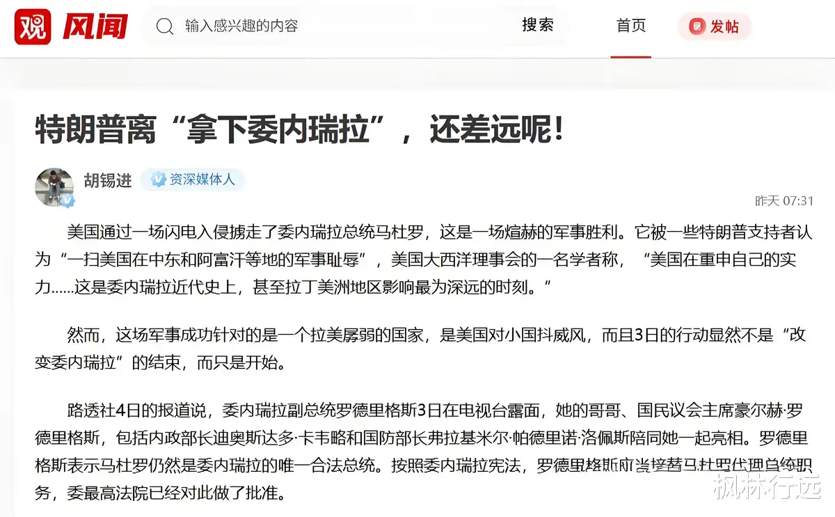 委内瑞拉总统马杜罗被美军抓获并带往纽约后,胡锡进很快在观察者网上登出一篇文章,题为《特朗普离“拿下委内瑞拉”,还差远呢!》,其意思大家都能明白,就是给委内瑞拉政府打气。