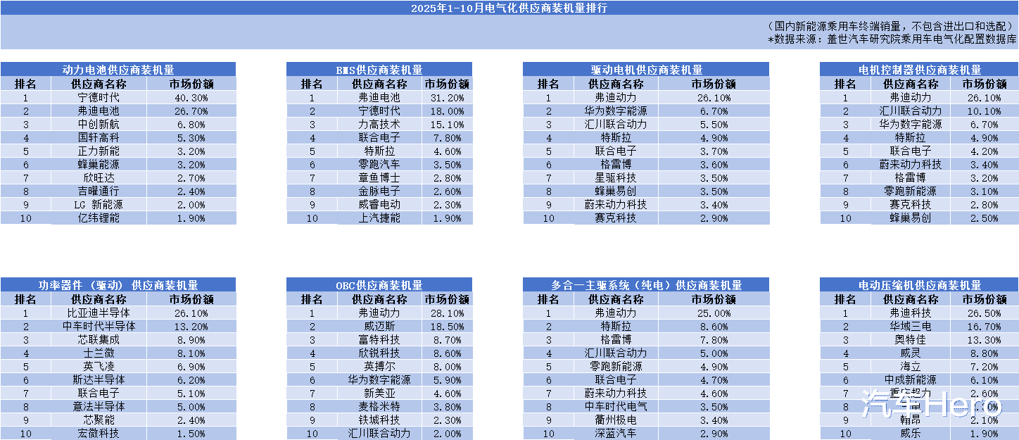 根据盖世汽车发布的2025年1-10月电气化供应商装机量排行数据,比亚迪旗下的弗迪电池、弗迪动力等子公司,在动力电池、驱动电机、电控系统等核心零部件的装机量榜单上,几乎都稳居榜首,充分彰显了比亚迪作为行业顶级核心零部件供应商的综合实力。