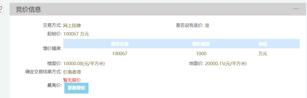 公告显示,该地块共约50033平,起拍价为100067万元,折合楼面价约10000元/平。