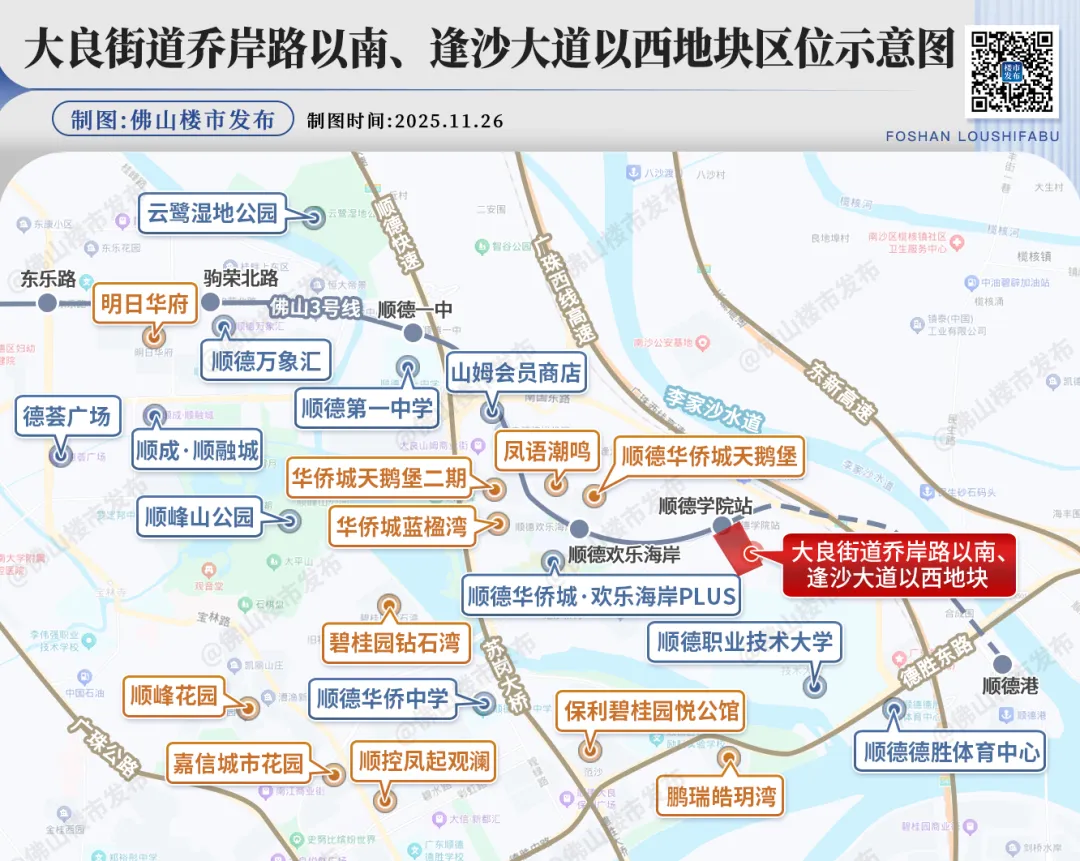 回看地块本身,区位优势明显,紧邻佛山3号线顺德学院站,附近还有广珠西线高速等方便出行。