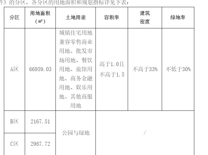 地块分为ABC三区,其中BC区为公园与绿地。而A区则为约66959平的宅地,容积率为高于1.0且不高于1.5,密度相当低。