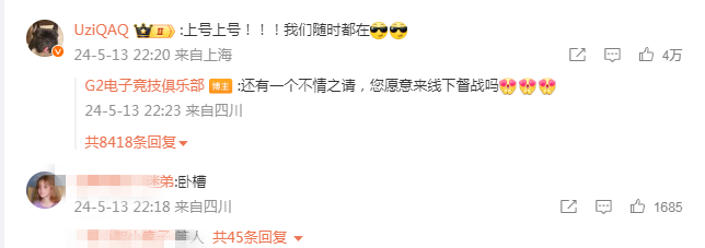 随后,双方在社交媒体上的友好互动更是引起了网友们的热烈讨论。UZI邀请G2上线进行训练赛,并表示他们随时待命;而G2则更加直接,邀请UZI进行线下督战。