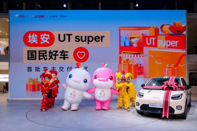 11月25日,在2025广州国际车展上,由京东、广汽集团与宁德时代三方共同推出的“国民好车”埃安UT super举行首批