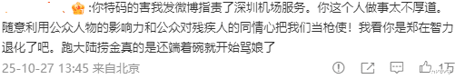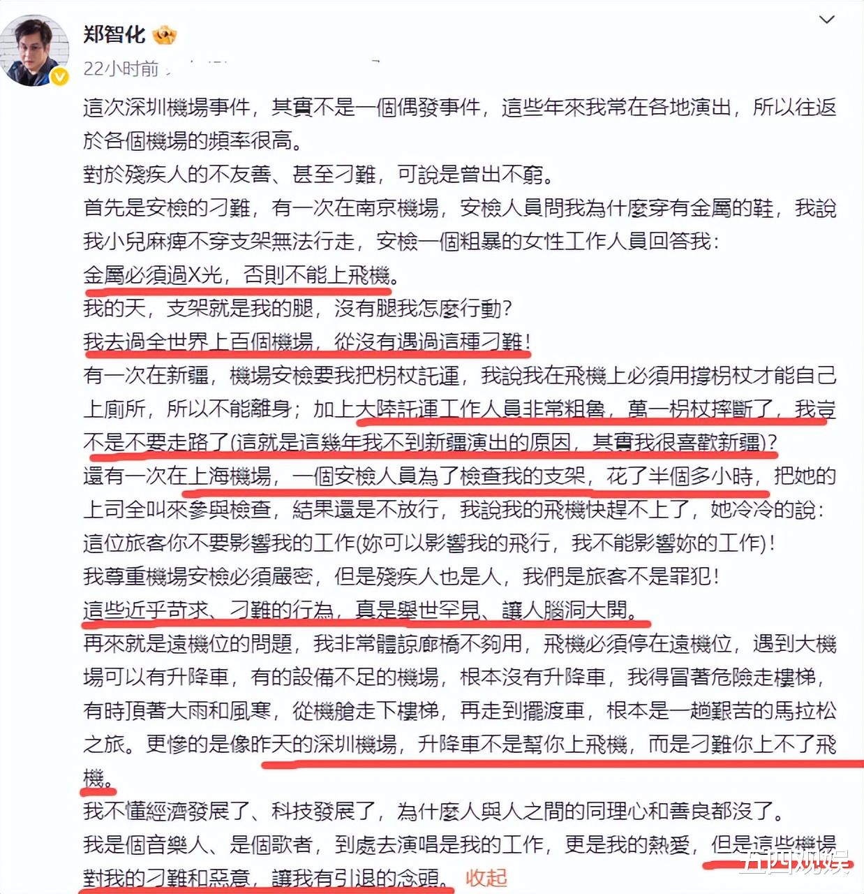 郑智化的一些粉丝宣布脱粉:你害我发声指责深圳机场的服务。你这个人做事太不厚道。随意利用公众人物的影响力和公众对残疾人的同情心,把我们当枪使!