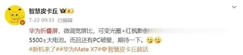 与此同时,另一位博主@智慧皮卡丘 则透露,华为全新折叠屏手机将微调宽屏比,并拥有可变光圈、红枫影像和潜望微距等特性。机身采用轻薄设计,测试 5500±mAh 大小的电池。还将具备“PC 破壁”功能。