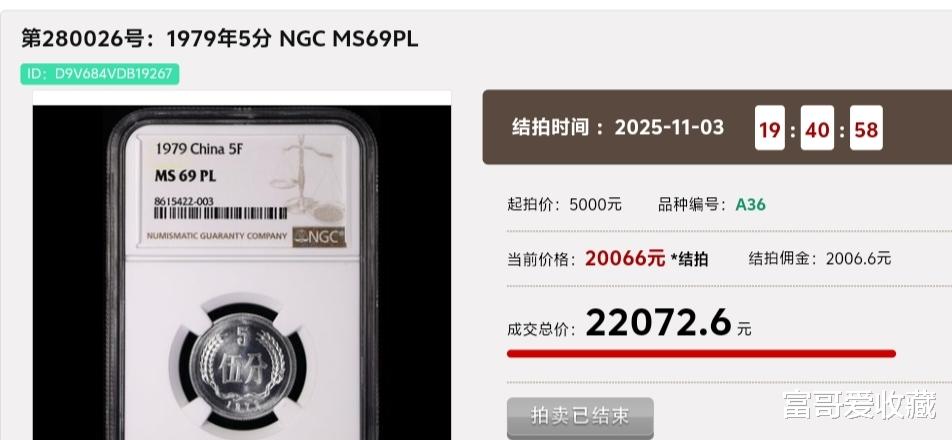 在2025年11月3日的“钱币拍卖会”中,一枚1979年的“5分硬币”,其NGC评级分数为MS69分(PL),最后拍出了22072.6元。