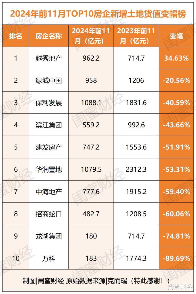 变幅方面,2024年前11月,TOP10房企难得出现一位新增货值同比上升的,且上升幅度还不小,那就是越秀地产。