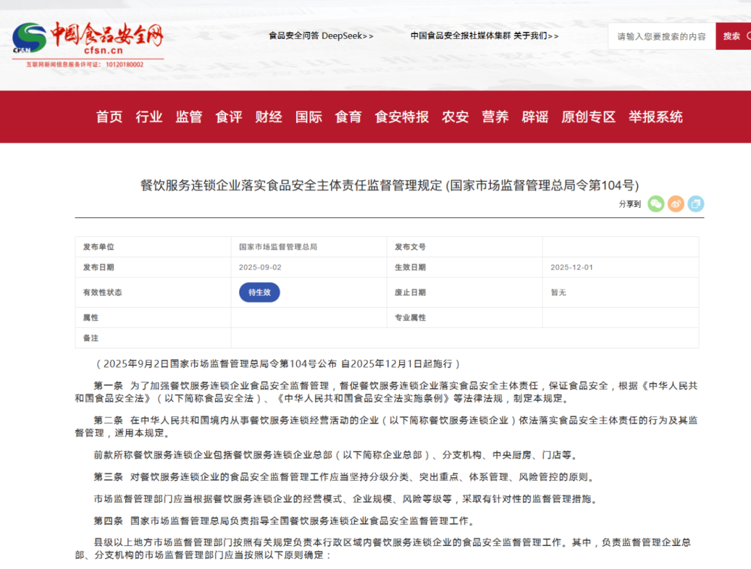 2025年12月1日,国家市场监督管理总局发布的《餐饮服务连锁企业落实食品安全主体责任监督管理规定》(以下简称《规定》)正式施行,这标志着中国连锁餐饮行业迎来了前所未有的监管变革。这部被业界视为里程碑式的规章,正在深刻重塑行业格局,推动连锁餐饮从“野蛮生长”迈向“责任闭环”的新阶段。