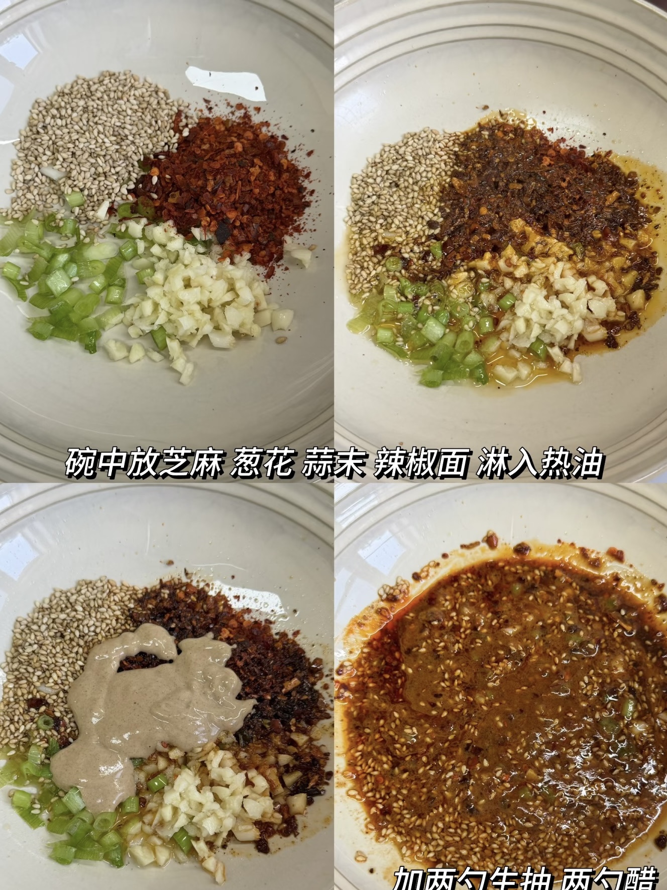咱们先从灵魂料碗开始说起。找一个稍微大点的碗,往里面撒上一把白芝麻,再来一勺红艳艳的辣椒面,切点葱花和蒜末铺上去。这时候关键的一步来了——烧一勺滚烫的热油,"滋啦"一声淋上去!那一瞬间,辣椒的香气、蒜的辛辣、芝麻的醇厚全都被激发出来了,满厨房都是让人咽口水的香味。趁着这股热乎劲儿,挖两大勺麻酱放进去,再倒两勺生抽、两勺醋,拿筷子搅和搅和,一碗红亮浓稠的酸麻酱汁就调好了。看着这色泽,是不是已经开始馋了?