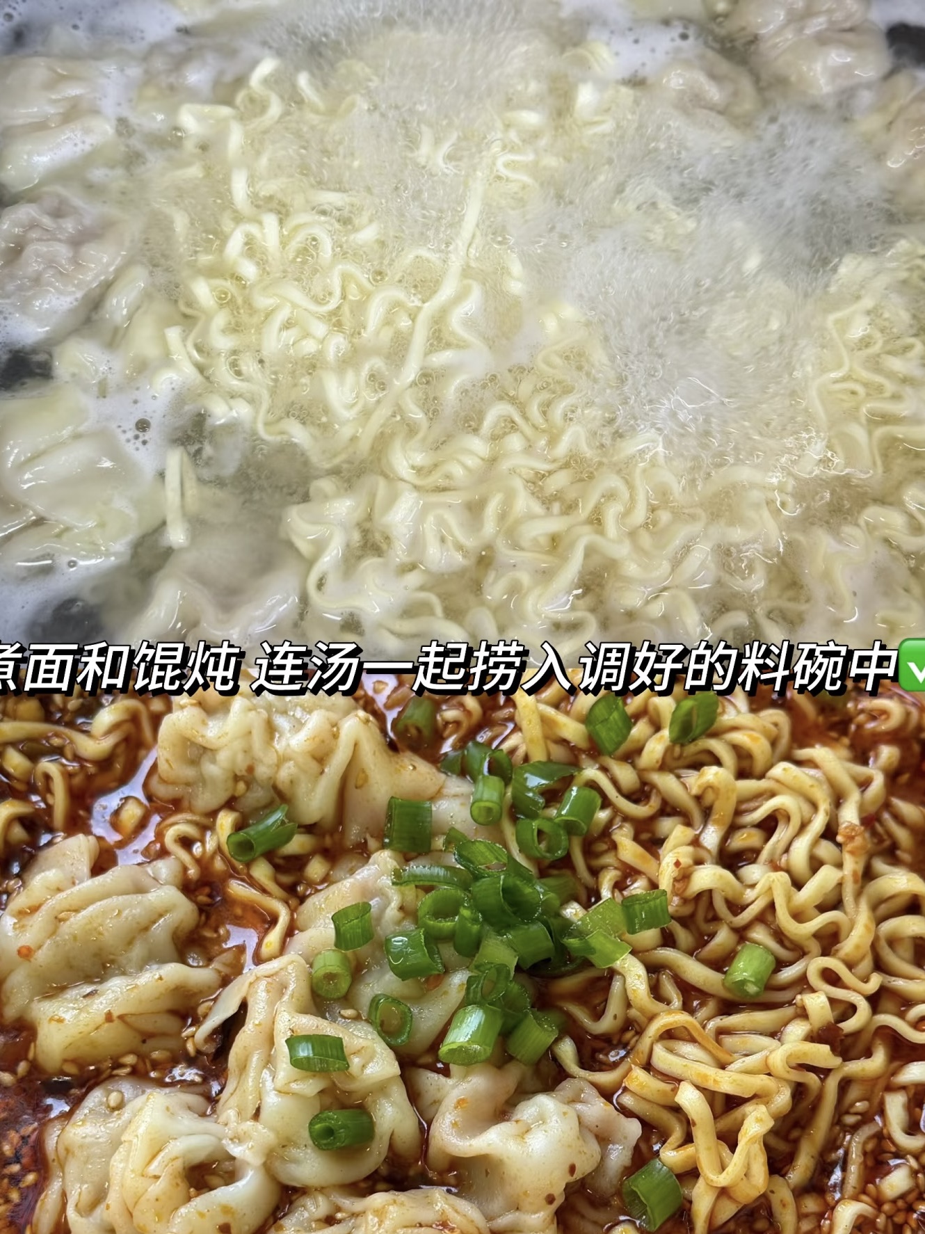 接下来就是煮食材的环节。烧一锅水,水开后把馄饨丢进去,等它们一个个浮起来,变得白白胖胖的,就把方便面也放进去。这里有个小窍门:方便面不要煮得太软,稍微有点筋道的时候刚刚好,因为等下还要连汤一起倒进料碗里,余热会让面条继续变软。煮好后,连面带汤一起捞进刚才调好的料碗中,热汤一冲,麻酱瞬间化开,和酸辣汁融为一体,那香味直接往鼻子里钻!