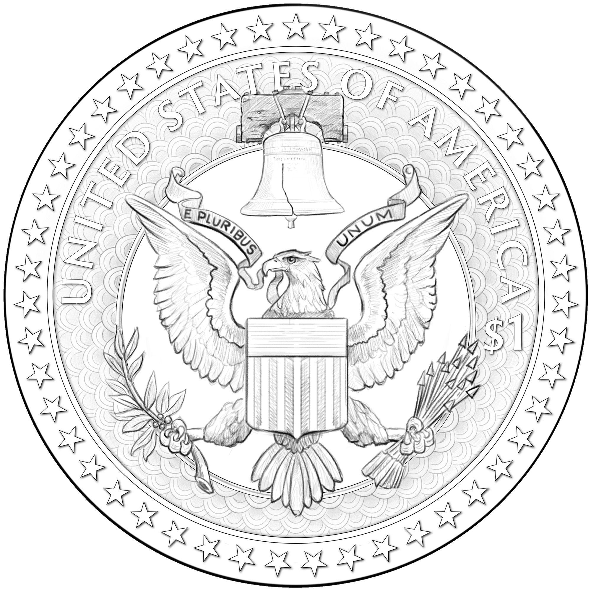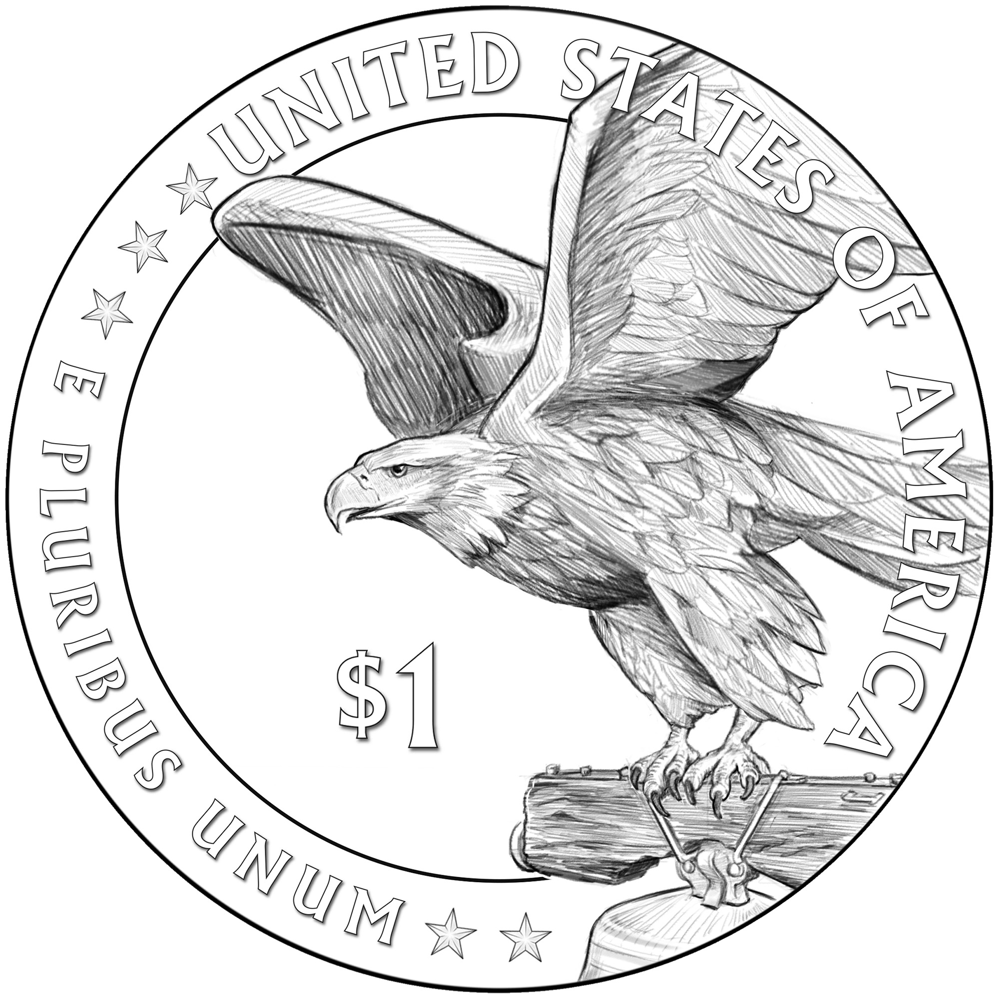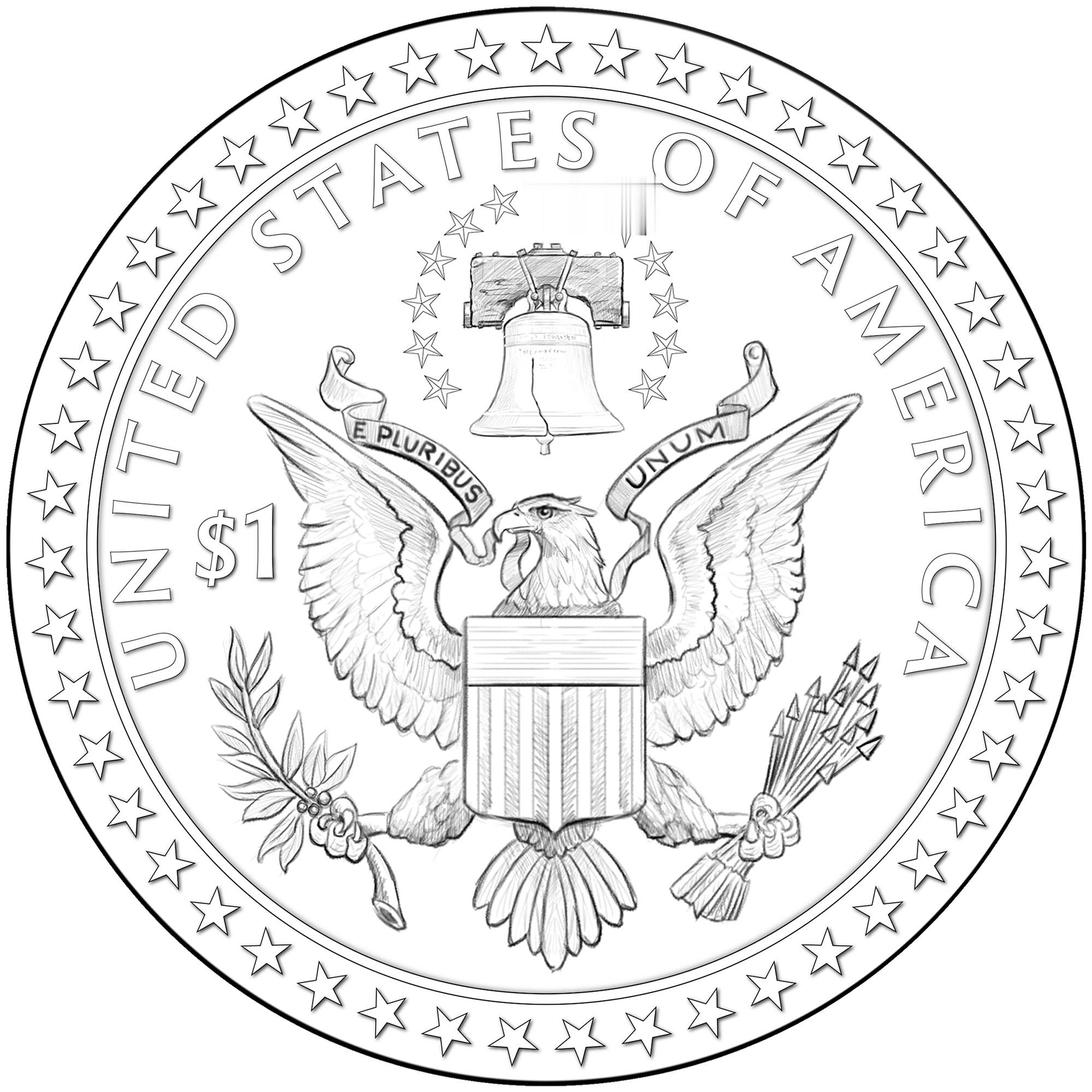 背面设计方案拟议背面设计方案则有8种之多,图案中央为一只鹰。不同设计上的铭文各不相同,但均包含“UNITED STATES OF AMERICA”(美利坚合众国)、“E PLURIBUS UNUM”(合众为一)和“ONE DOLLAR”(一美元)等字样。