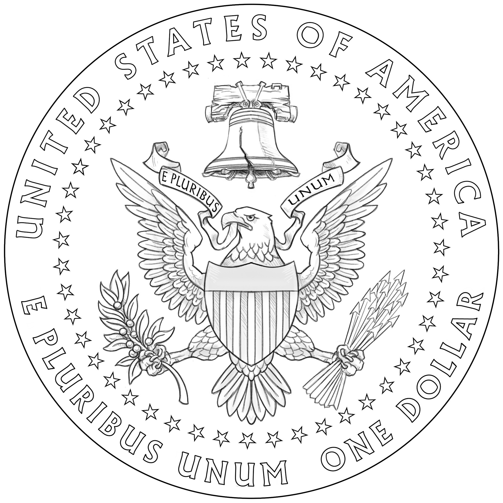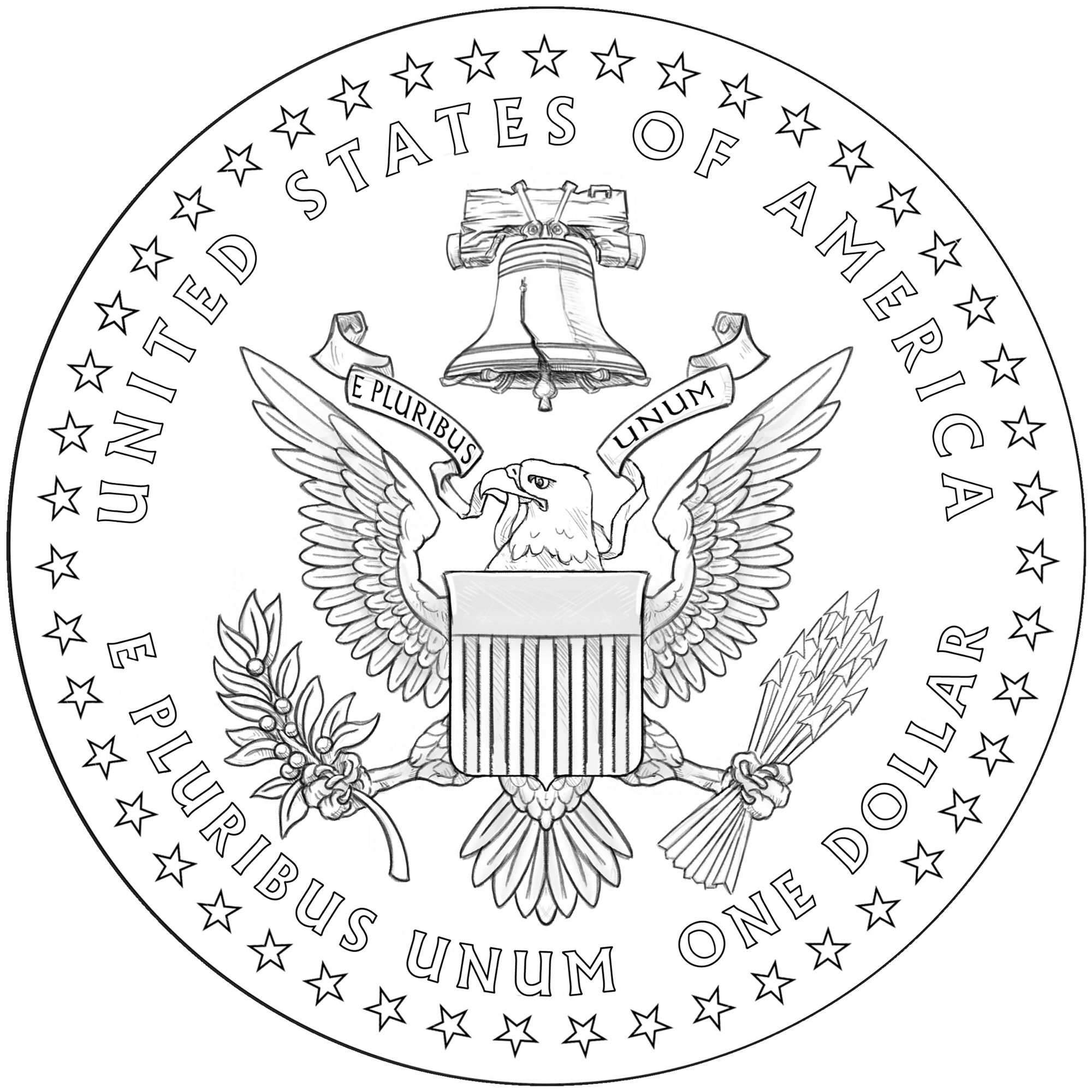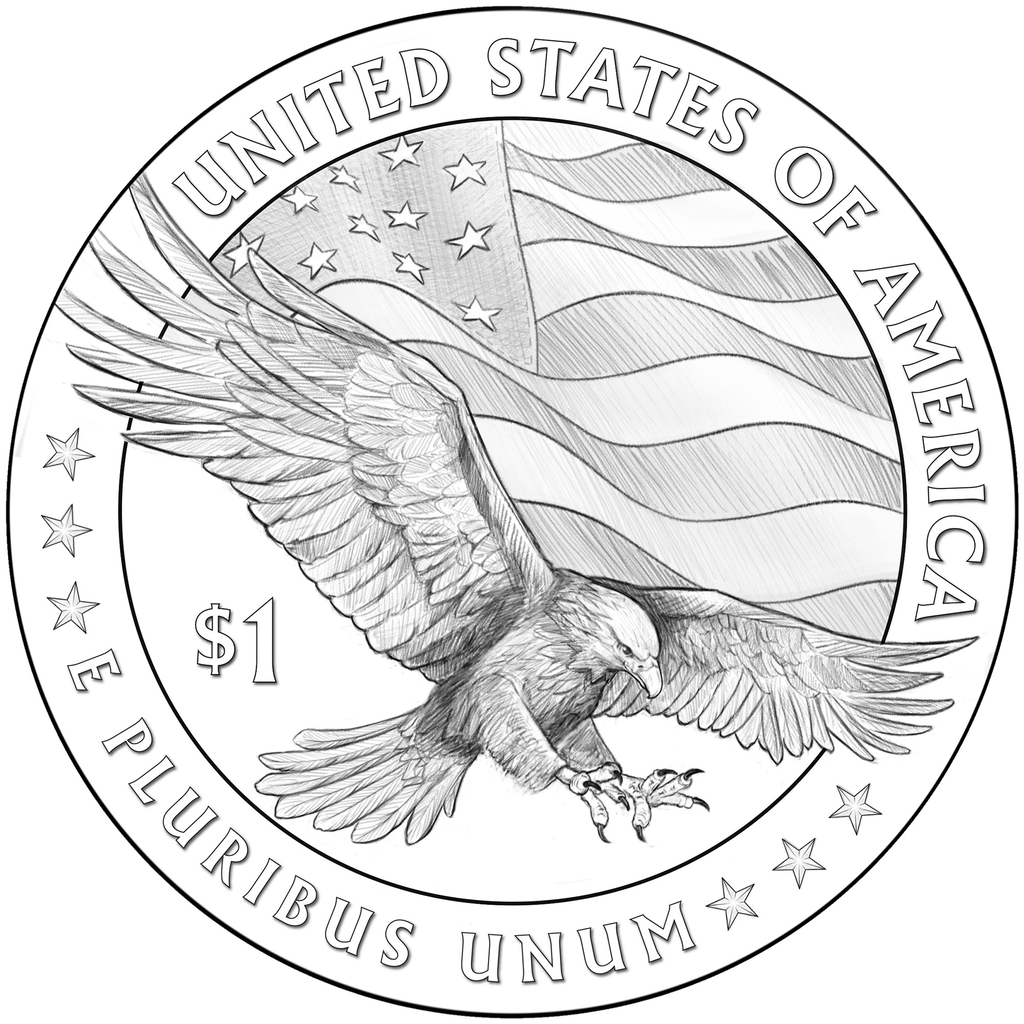 背面设计方案拟议背面设计方案则有8种之多,图案中央为一只鹰。不同设计上的铭文各不相同,但均包含“UNITED STATES OF AMERICA”(美利坚合众国)、“E PLURIBUS UNUM”(合众为一)和“ONE DOLLAR”(一美元)等字样。