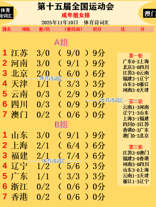 截止今晚,成年组女排积分榜如下:A组:1、江苏3胜9分;2、河南3胜9分;3、北京2胜6分;4、天津1胜1负3分;5、云南3负0分;6、四川3负0发呢;7、澳门2负0分。