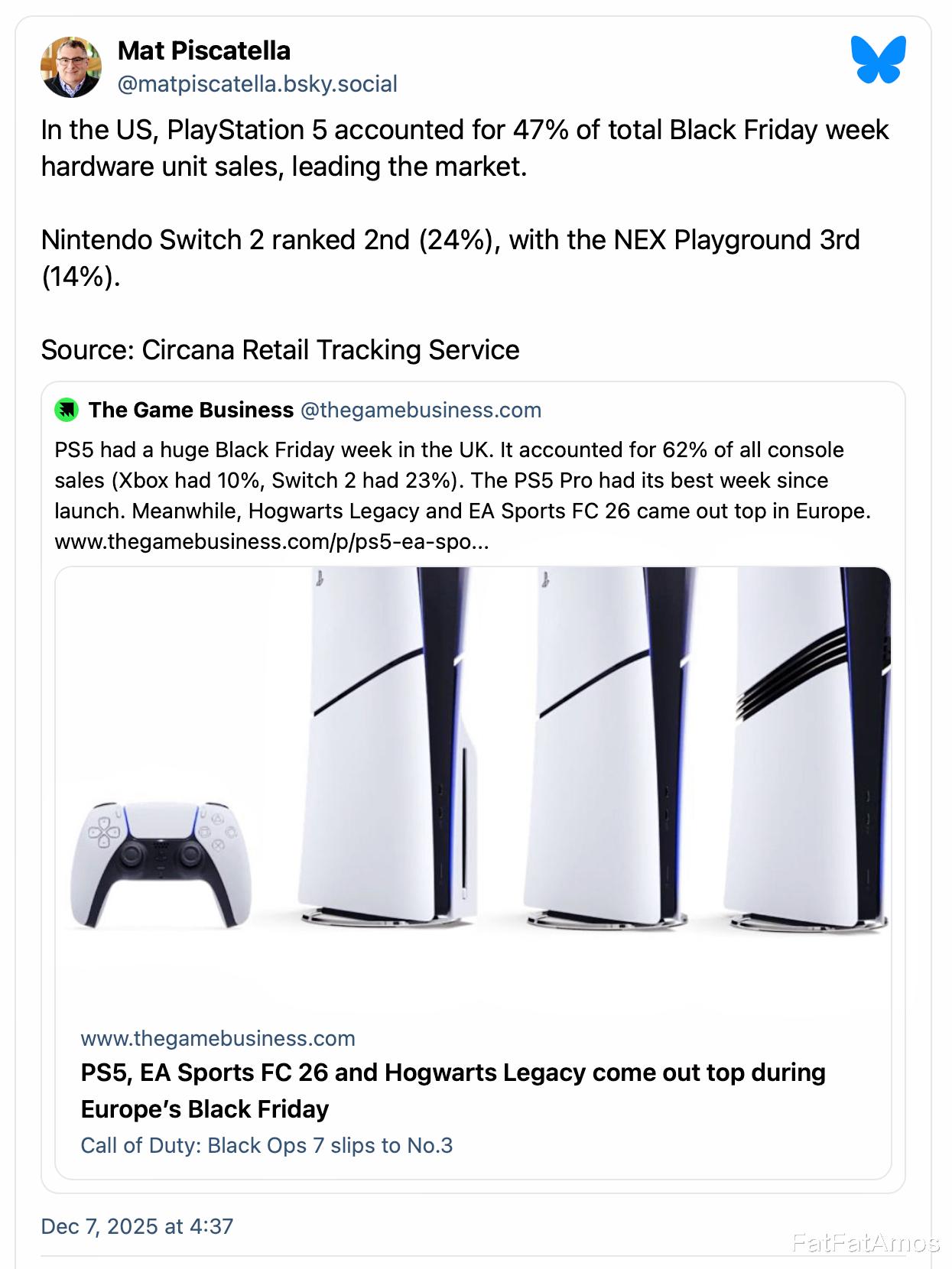 全球统计机构Circana数据显示:2025黑五期间,美国市场上PS5市占率高达47%,几乎以一己之力重塑主机格局;而Xbox,在自己老家的榜单中甚至没能挤进前三。要知道,这可是它苦心经营二十年的主场。