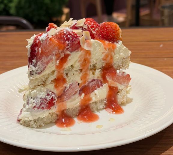 当蛋糕被小心地分切开来,可以看到清晰的层次:松软的蛋糕、柔滑的奶油、多汁的草莓,还有那星星点点的椰蓉渗透其中。每一口都同时包含着草莓的微酸清甜、奶油的香醇以及椰子特有的热带气息,口感丰富而又平衡。
